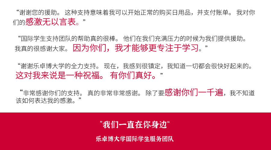 在乐卓博大学,我们把学生当作自己的家人,在他们面对压力时,尽自己所能,帮助他们应对这一系列的变化,给他们鼓励和支持,使他们能调整心态,保持正常的生活,完成学业。