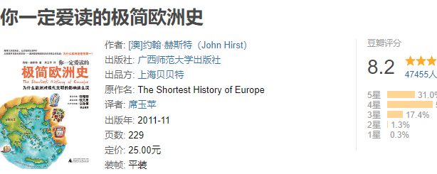 提起《极简欧洲史》这本书,想必一定有很多小伙伴听过甚至读过。这是一本豆瓣近五万人评出8.2高分,解读视频在B站观看量超40万的经典畅销之作。