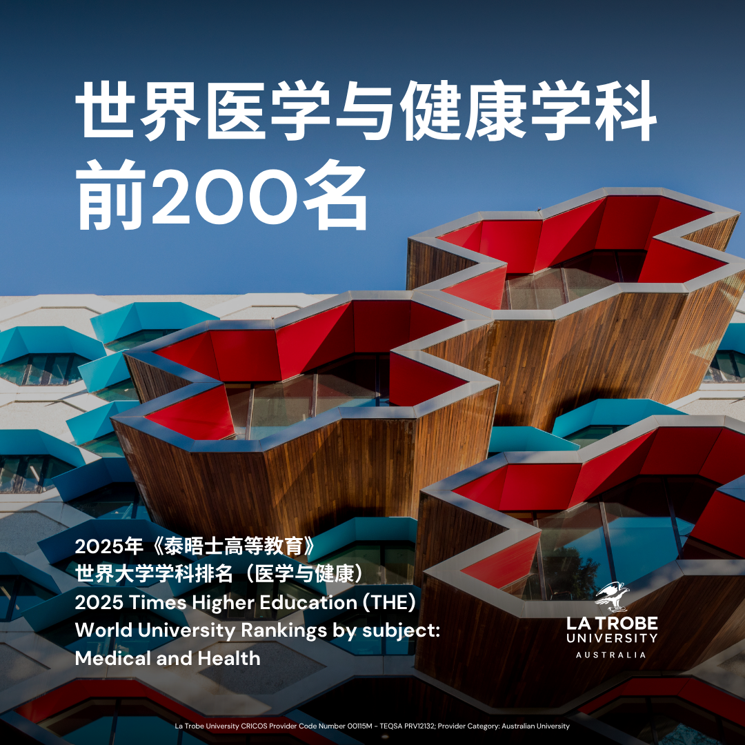 免责声明:本文中包含的信息仅供参考。尽管我们在出版时尽力提供完整准确的信息,但本大学不保证其准确性、时效性或完整性。本大学保留随时全权自行决定变更内容的权利,包括但不限于变更录取或评估要求,或变更或停止任何课程或科目。在法律允许的范围内,本大学不对因使用本文中的任何信息而导致的任何损失或损害承担责任。相关更新课程信息请访问:latrobe.edu.au/courses
