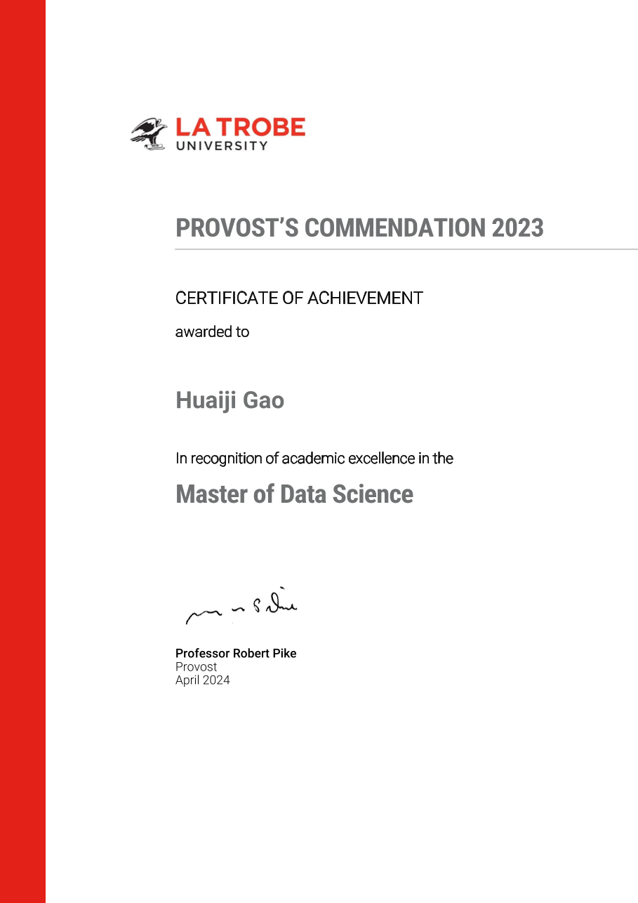 校内荣誉: Provost’s Commendation WAM 94/100, Highest Achieving Student
